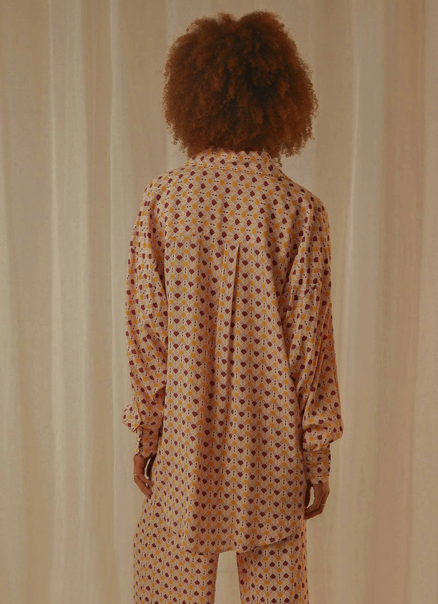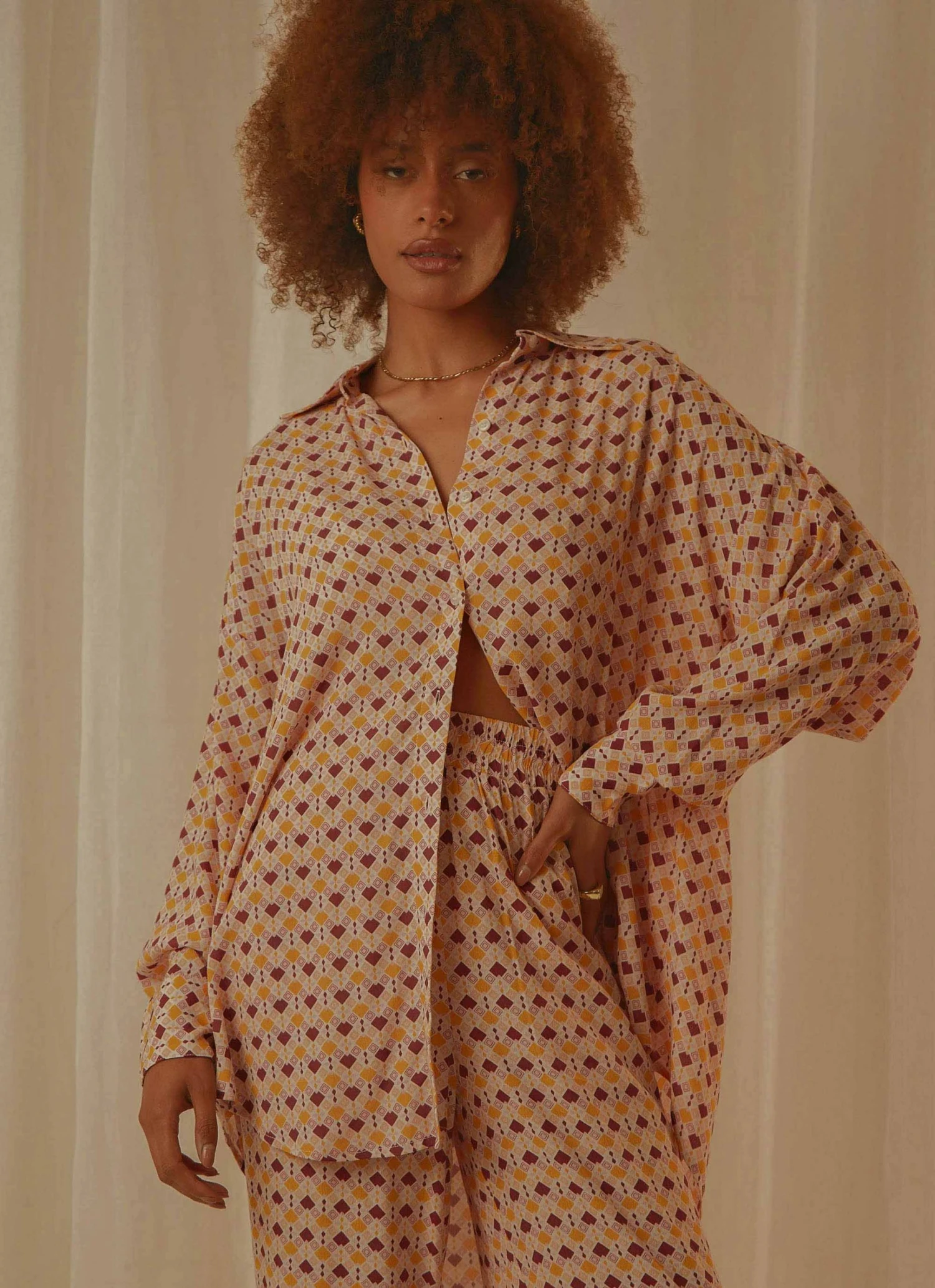 We’re feeling all the retro vibes in the Maple Shirt. This relaxed fit shirt features and eye-catching geometric print. Work it back with the coordinating Amelie palazzo pants for an elegant loungewear look.