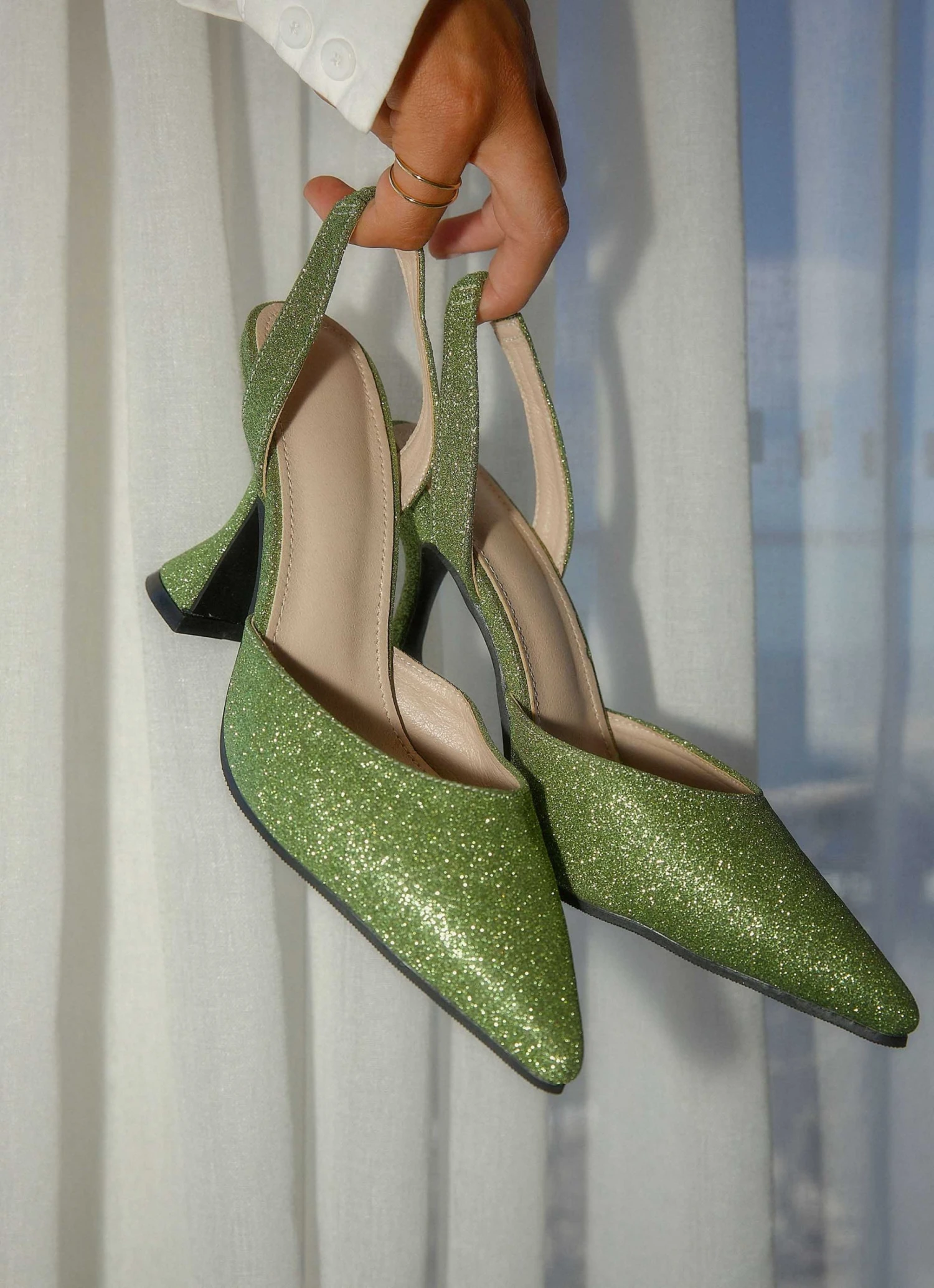 Add serious style points to your look with our Style Studio heels. This sparkly lurex covered style from our faves Cult Ave, showcases a pointed toe design, and is finished with a sparkly sling back strap and a sculpted heel.