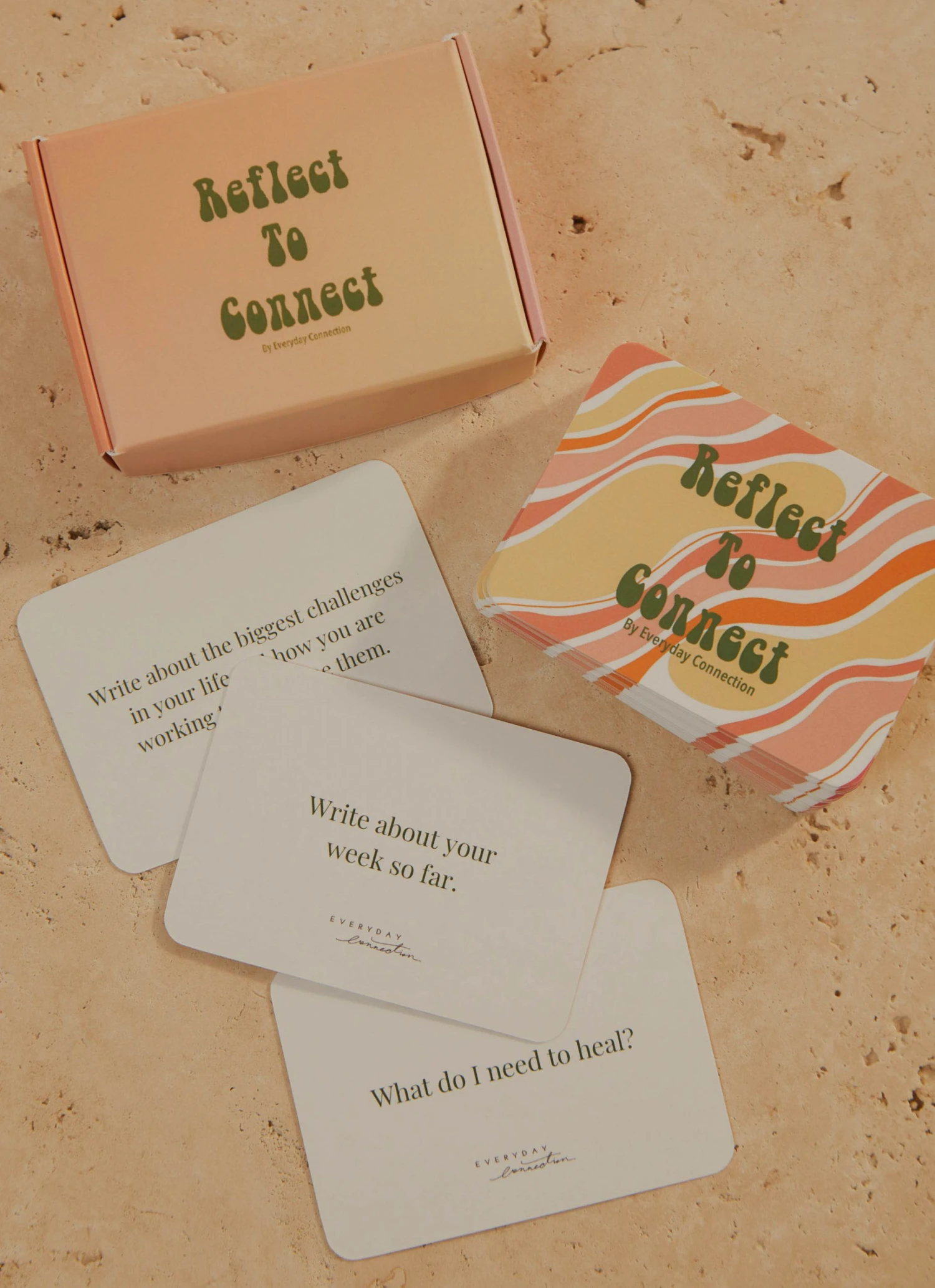 Reflect to connect includes 50 journal prompt cards to spark reflection and connection with yourself. Self awareness is your new superpower, as you dig deep and get honest with yourself. What is more empowering than knowing yourself?