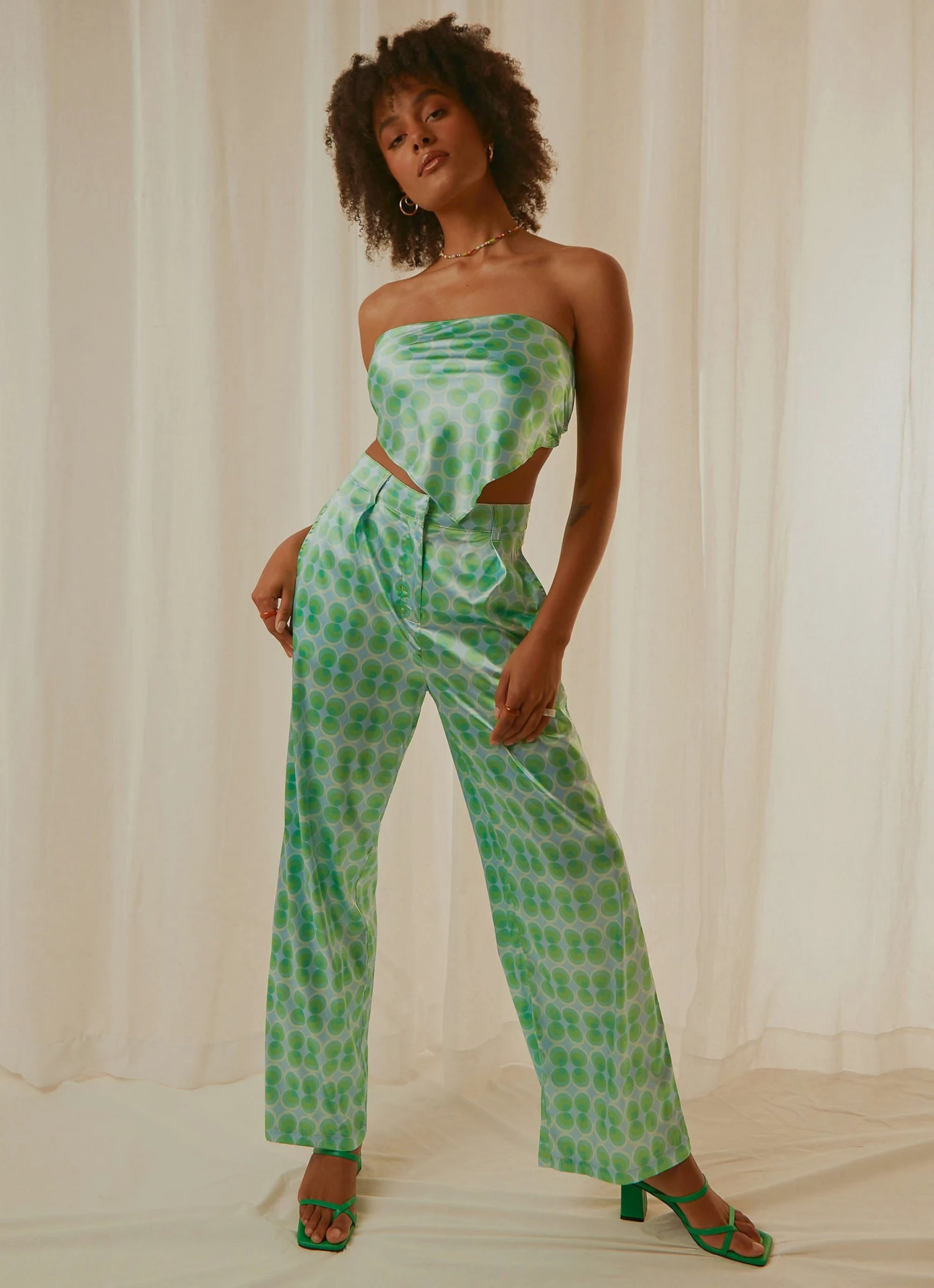 Get your Groove on! We are feeling all the retro vibes with our “Past Treasures” pants. We love this worn withe the matching “Better Retro” Scarf Top and heeled mules for the full vibe.