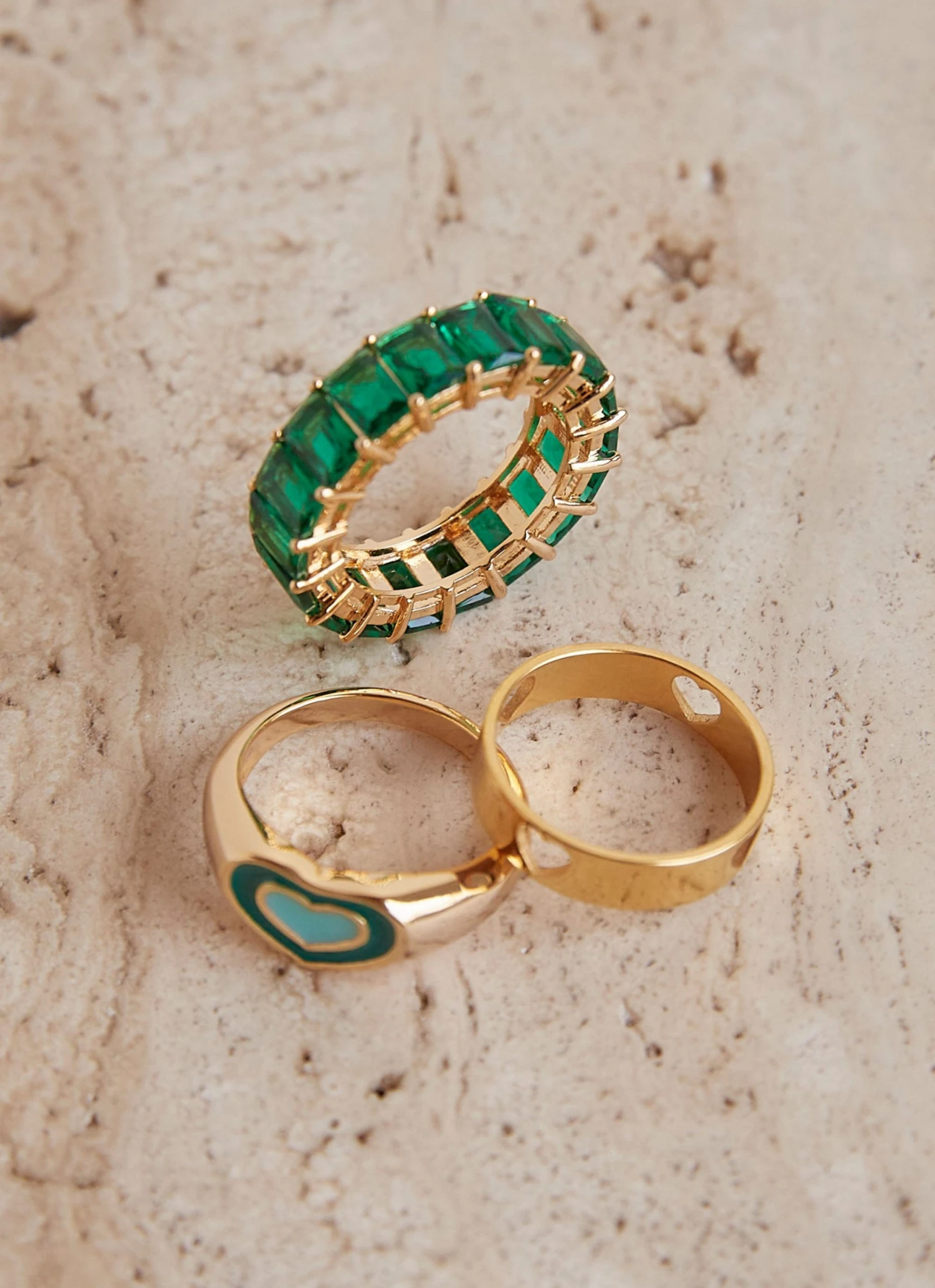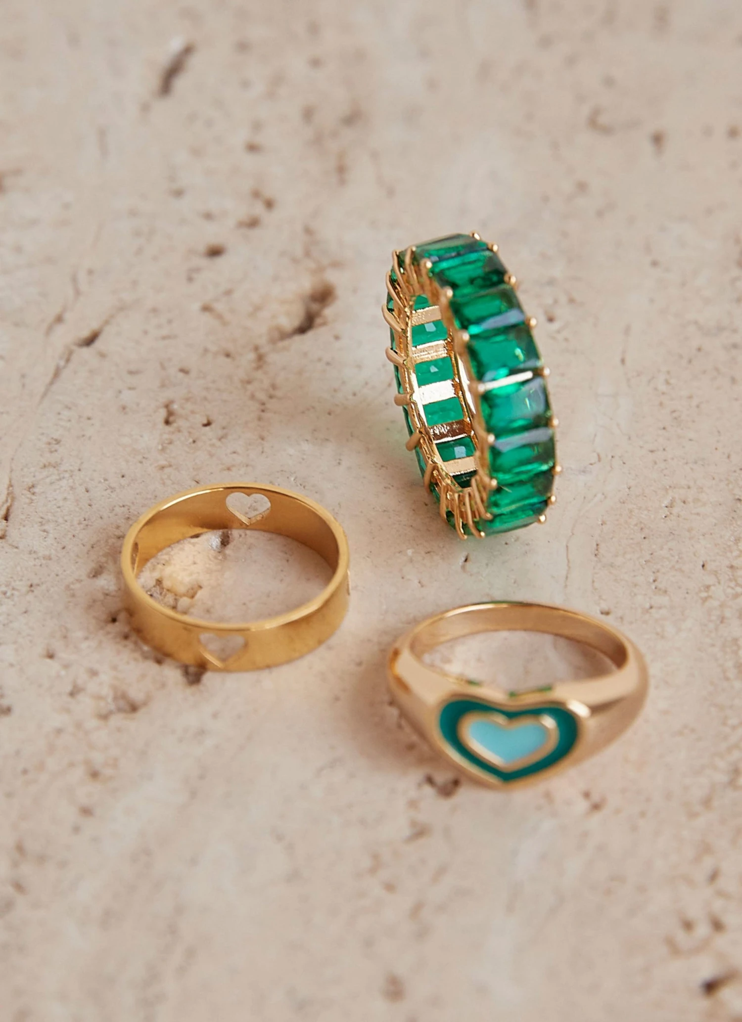 – Thick gold ring with green and blue heart detailing